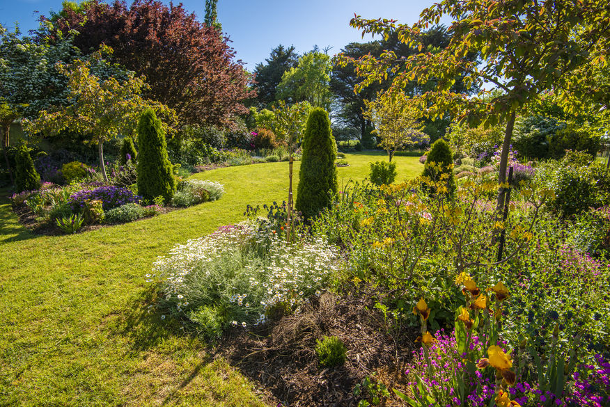 Description: Large country garden featuring mature trees, shrubs, perennials, several water features, tree peonies, an espaliered orchard and a touch of whimsy!